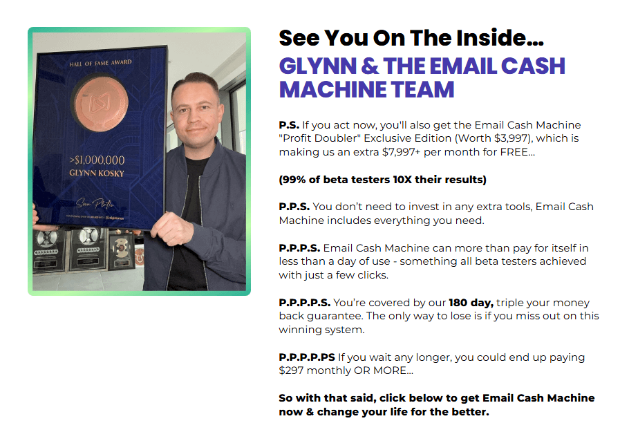 When set up properly (and it only takes a few minutes), Email Cash Machine can turn a simple email into a steady stream of commissions—without running ads, building funnels, or hiring expensive copywriters.